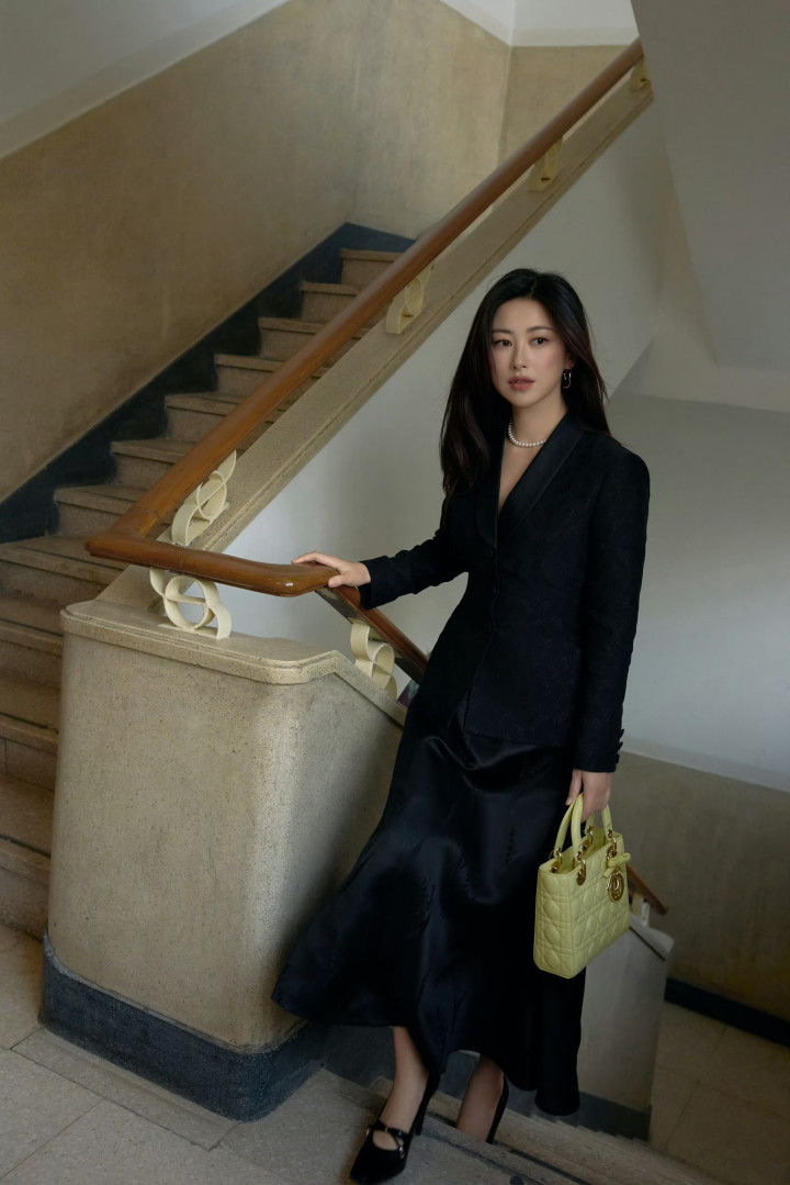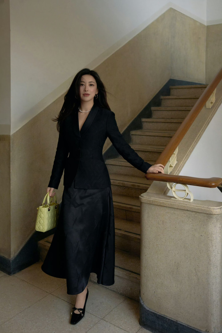 黑色西装的利落剪裁,中和了缎面半裙的柔媚光泽,刚与柔的碰撞恰到好处,在利落与温婉间勾勒出极具张力的优雅线条。