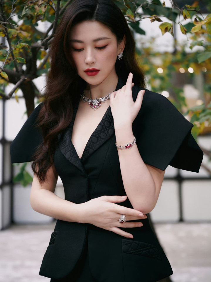 浓艳妆面气场全开,明艳感扑面而来;而叠戴的全套红宝石珠宝,钻光璀璨与宝石浓郁交相辉映,繁复却不杂乱,与浓妆形成完美呼应,将华丽质感和强大气势融合得恰到好处。
